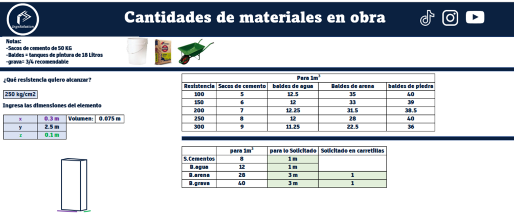 Esta plantilla te permite saber la cantidad de arena, cemento, grava y agua necesaria para la construcción de tu elemento estructural.